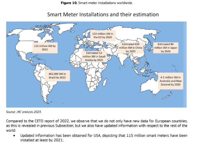 - 全球安裝了超過12億臺智能電表,其中歐洲、澳大利亞和北美是該領(lǐng)域的先驅(qū),僅在歐盟安裝了超過 1.23 億臺智能電表(小編補充:中國迄今已安裝超過6億只智能電表)。