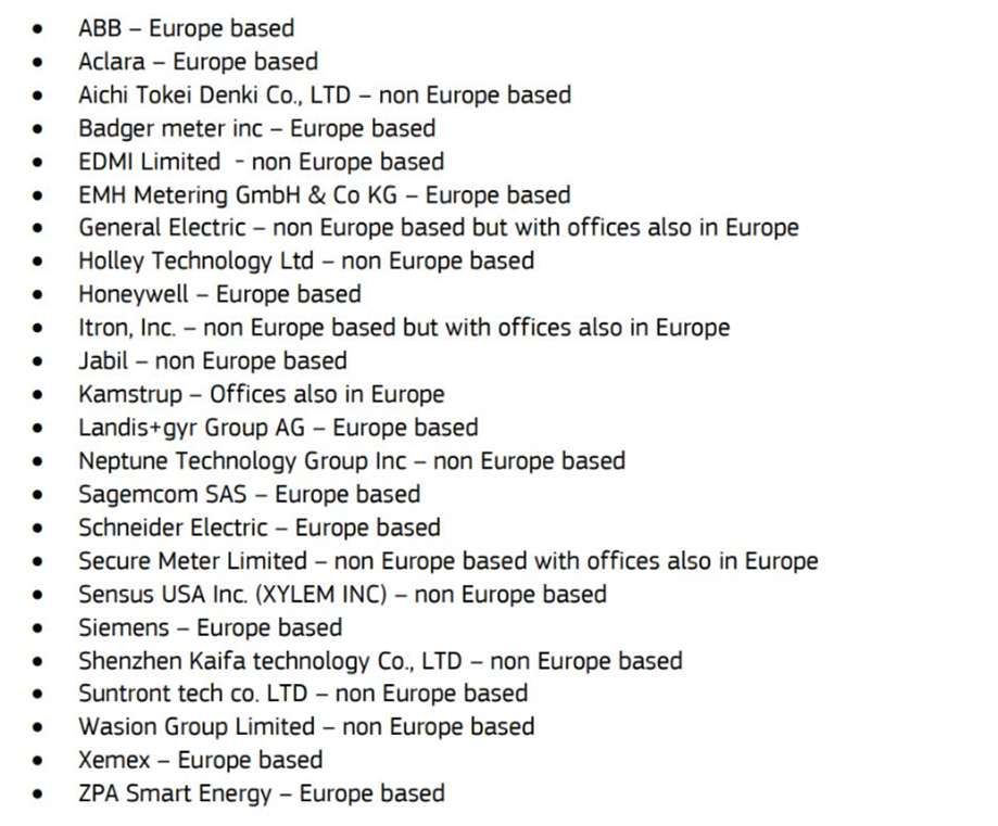 附下是一些智能電表市場領(lǐng)先者的名單(按字母順序,并非詳盡無遺),證明了全球智能電表計劃的合理性。正如我們所看到的,歐洲制造商在該領(lǐng)域擁有強大的影響力。除了列出制造商外,還試圖根據(jù)其所在地對制造商進行分類,以確定歐洲制造商。雖然對于一些制造商來說,他們的分類相當(dāng)簡單,但對于其他制造商來說,很難說,因為他們在世界各地都有活動,而對于其他制造商來說,信息不足以斷定他們是否在歐洲也有辦事處。以下列表給出了歐洲制造商在該領(lǐng)域的存在,并表明了這種情況。