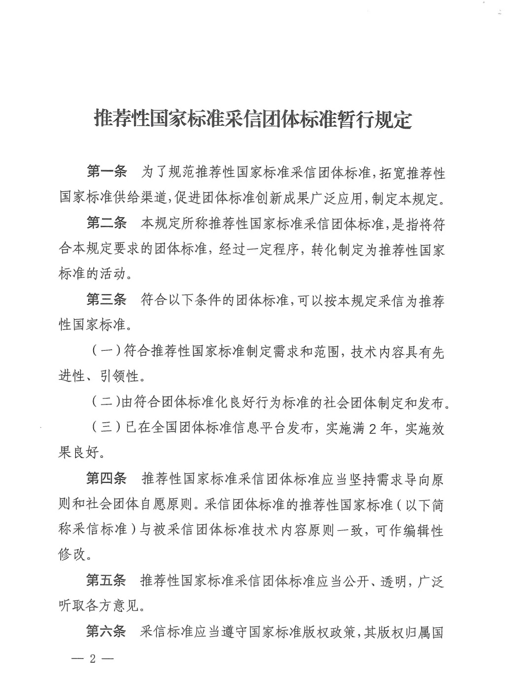 《推薦性國家標準采信團體標準暫行規定》結合我國現有推薦性國家標準和團體標準特點,在推薦性國家標準工作機制基礎上,暢通渠道、簡化程序、縮短時間,規范國家標準采信團體標準程序。