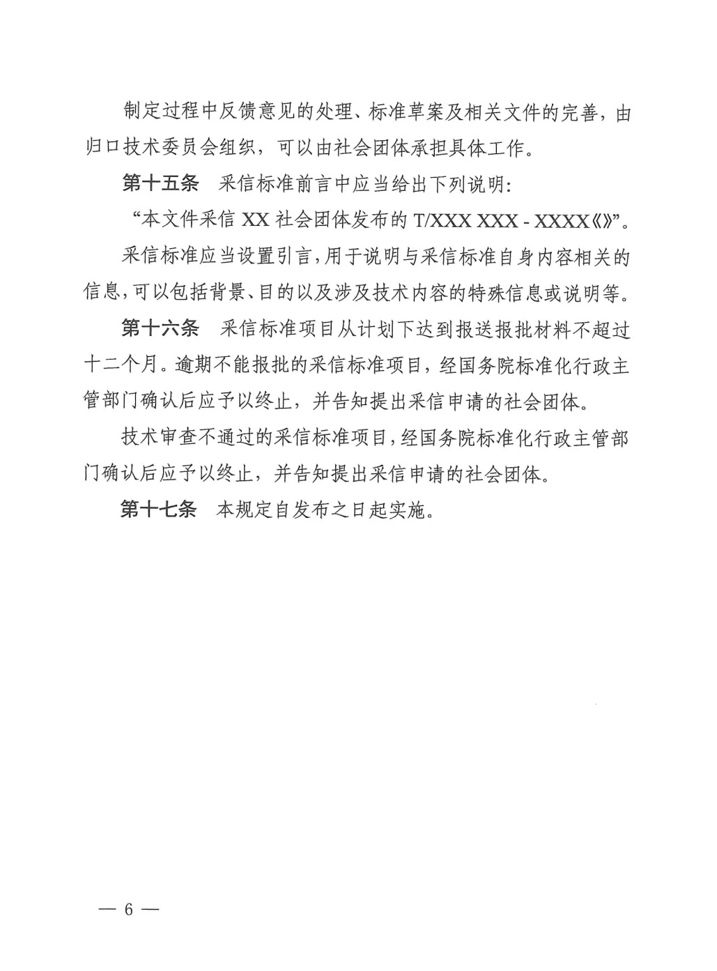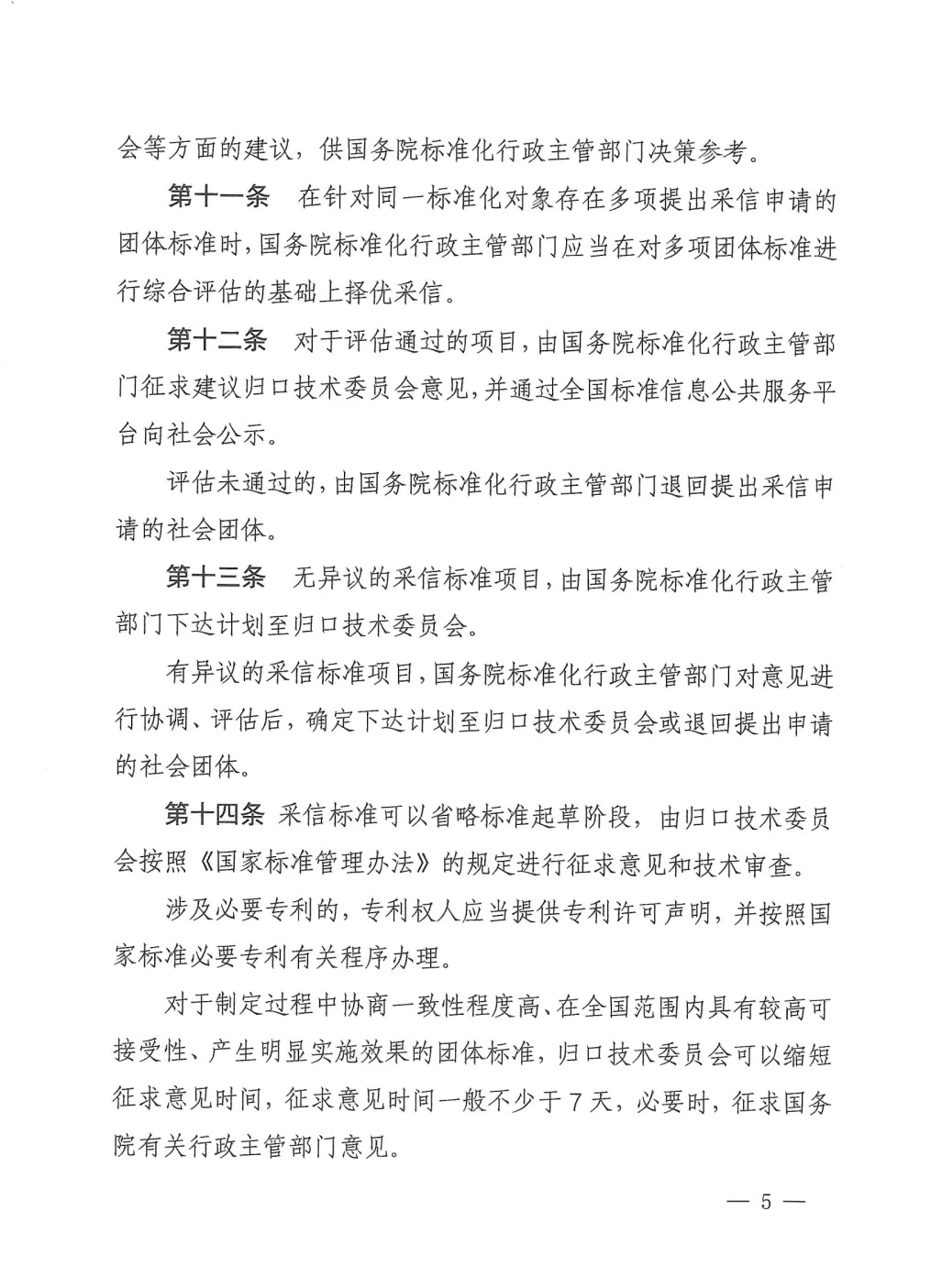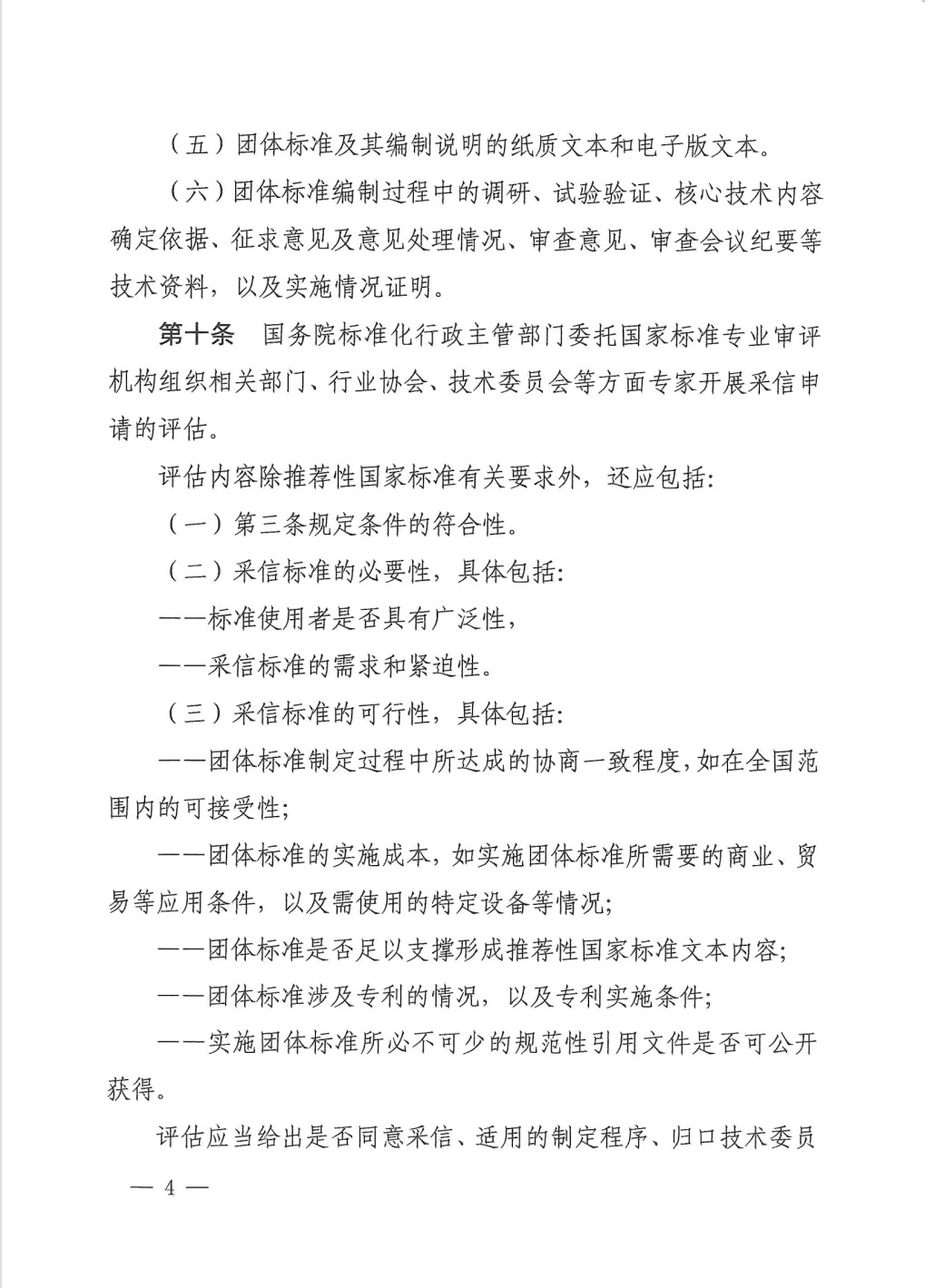 三是符合團體標準化良好行為標準的社會團體。通過評價符合《團體標準化 1部分:良好行為指南》(GB/T 20004.1)、《團體標準化 第2部分:良好行為評價指南》(GB/T 20004.2)等國家標準的社會團體,其制定的標準才具備被采信條件。