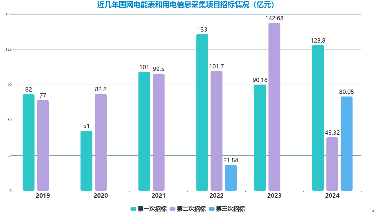 2024年國網3個批次電能表和用電信息采集項目公示中標金額達到249.17億元,同比2023年增長7%左右;3個批次招標總量9198萬只,同比增長25%。其中:單相表招標7568萬只,同比增長31%;三相表招標1366萬只,同比增長0.56%,其中高端智能電表招標1.5萬只;采集器等設備招標265萬只,同比增長25%。