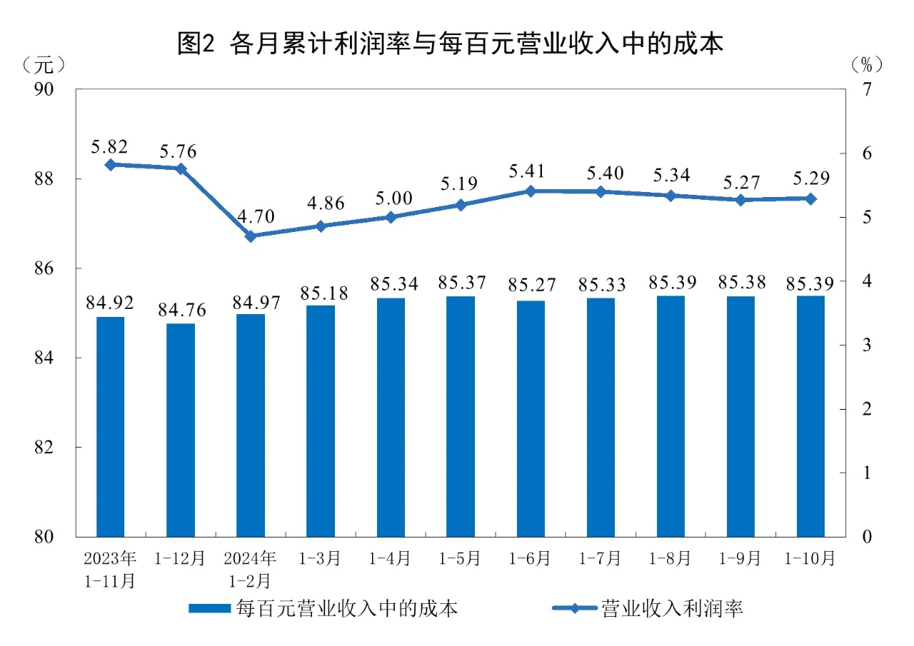 1—10月份,規(guī)模以上工業(yè)企業(yè)實(shí)現(xiàn)營(yíng)業(yè)收入110.96萬(wàn)億元,同比增長(zhǎng)1.9%;發(fā)生營(yíng)業(yè)成本94.75萬(wàn)億元,增長(zhǎng)2.3%;營(yíng)業(yè)收入利潤(rùn)率為5.29%,同比下降0.34個(gè)百分點(diǎn)。