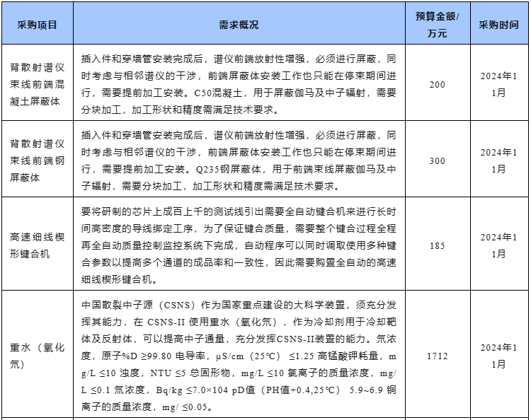 近日,中國科學(xué)院高能物理研究所發(fā)布25項(xiàng)儀器設(shè)備采購意向,預(yù)算總額達(dá)0.98億元,涉及CSNS-II逆幾何分子振動譜儀分析晶體、高速細(xì)線楔形鍵合機(jī)、背散射譜儀束線前端鋼屏蔽體、X射線大視場平板成像探測器等,預(yù)計(jì)采購時(shí)間為2024年10月~2025年1月。