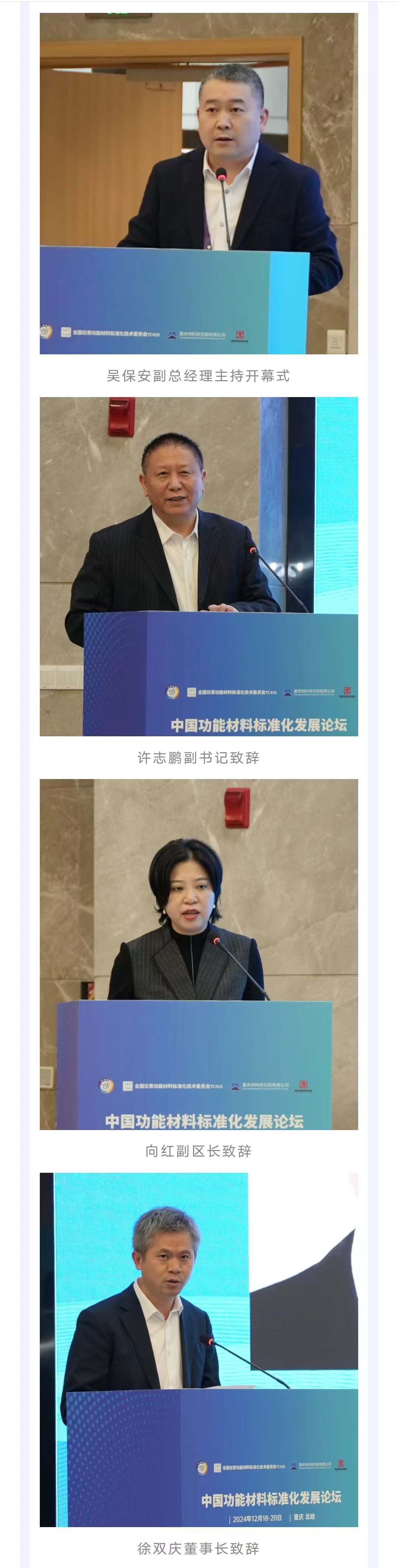 開幕式由重材院黨委委員、副總經(jīng)理(主持經(jīng)理層工作)吳保安主持。許志鵬副書記、向紅副區(qū)長、徐雙慶董事長分別致辭并指出功能材料是支撐國民經(jīng)濟發(fā)展的基礎性產(chǎn)業(yè),是產(chǎn)業(yè)基礎再造的主力軍和工業(yè)綠色發(fā)展的主戰(zhàn)場。標準在功能材料工業(yè)發(fā)展中發(fā)揮著基礎性、引領性作用。希望與會專家學者凝心聚力,積極建言獻策,不斷開創(chuàng)功能材料標準化工作新局面,為發(fā)展新質生產(chǎn)力,實現(xiàn)功能材料行業(yè)高質量發(fā)展貢獻力量。