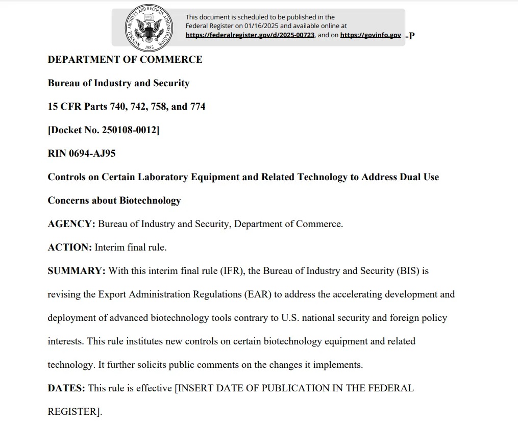 2025115日,美國商務部工業與安全局(BIS)發布一項新的出口管制規定,對《出口管理條例》(EAR)進行修訂,以應對生物技術領域的兩用性問題。該規則對某些生物技術設備及相關技術實施了新的管控措施,并就這些變更征求公眾意見。