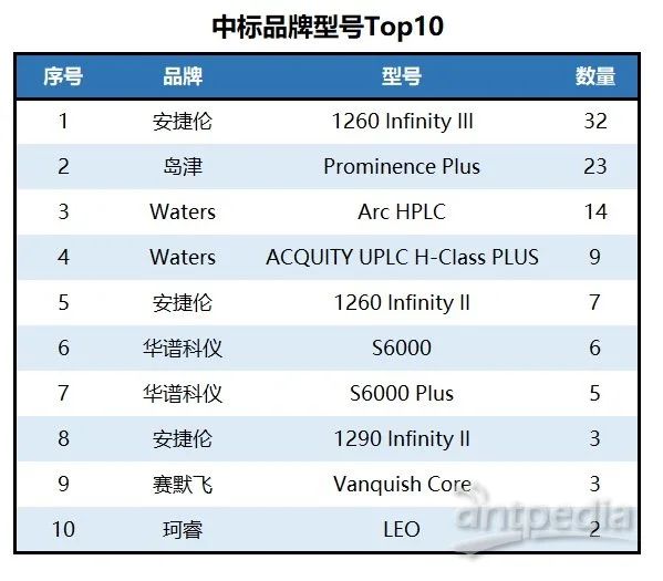 根據(jù)此次中標(biāo)結(jié)果,分析測(cè)試百科網(wǎng)梳理出品牌熱門型號(hào) Top10。從中標(biāo)型號(hào)分布來(lái)看,安捷倫憑借1260系列(含Infinity III、Infinity II)全面領(lǐng)跑市場(chǎng),其中1260 Infinity III以32臺(tái)(套)的絕對(duì)優(yōu)勢(shì)獨(dú)占鰲頭,憑借高精度、高穩(wěn)定性和廣泛的應(yīng)用場(chǎng)景,贏得了海關(guān)單位的青睞。島津Prominence Plus系列和Waters的Arc HPLC與ACQUITY UPLC H-Class PLUS分別位列二、三、四位。國(guó)內(nèi)品牌中,華譜科儀的S6000和S6000 Plus與珂睿的LEO成為唯二上榜的國(guó)產(chǎn)代表型號(hào)。整體而言,國(guó)際品牌的多種型號(hào)依舊主導(dǎo)市場(chǎng),國(guó)產(chǎn)設(shè)備在技術(shù)適配性和應(yīng)用場(chǎng)景拓展方面,仍有較大的提升空間。