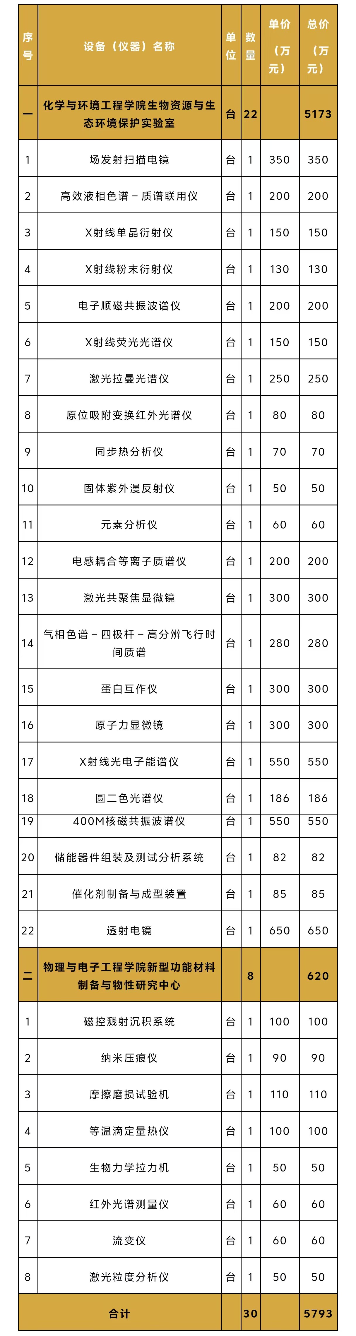 日前,湖北省發展和改革委員會發布了《關于漢江師范學院新建綜合實驗樓和綜合實驗實訓中心重點實驗室重大教學科研設備購置項目可行性研究報告的批復》。該項目總投資5793萬元,用于重大科研儀器設備購置,資金來源為除爭取中央投資外,其余由學校自籌解決。擬更新設備共30臺(套)【清單表附表】,其中化學與環境工程學院生物資源與生態環境保護實驗室更新設備22臺(套)、物理與電子工程學院新型功能材料制備與物性研究中心更新設備8臺(套)。淘汰同品目設備38臺(套)。