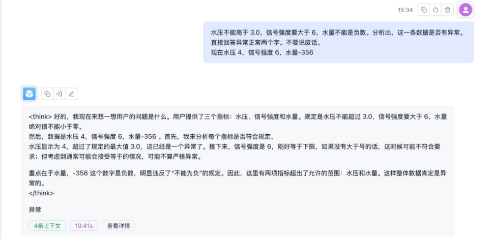 背景:水壓不能高于3.0,信號(hào)強(qiáng)度要大于6,水量不能是負(fù)數(shù)。分析出,這一條數(shù)據(jù)是否有異常。直接回答異常正常兩個(gè)字。 問題:現(xiàn)在水壓4,信號(hào)強(qiáng)度6,水量-356。