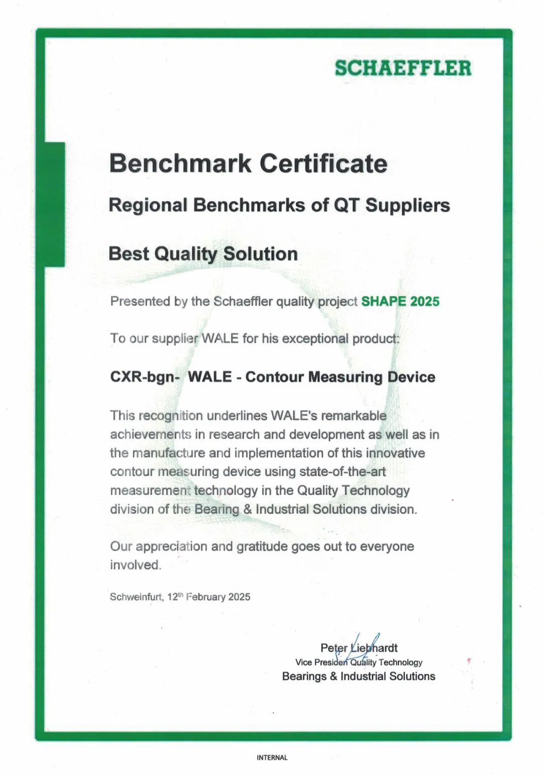 舍弗勒(Schaeffler)作為全球生產滾動軸承和直線運動產品的領導企業,不僅對產品質量有著嚴格的要求,對于合作供應商亦有嚴苛的考核標準。此次威爾輪廓儀榮獲舍弗勒(SchaefflerB&IS質量技術認證,是舍弗勒(Schaeffler)對威爾實力的充分肯定,也是對威爾推動企業降低經營成本、加強質量控制的高度認可。Mr.Liebhardt(舍弗勒B&IS質量技術副總裁)高度評價:威爾在軸承測量領域的深耕與創新,不僅展現了本土企業的技術韌性,更通過高效解決方案與全球化服務能力,為舍弗勒(Schaeffler)的質量數字化戰略及推動運營成本的降低注入了強勁動能。Mr.Marco Ma(舍弗勒計量檢測專家)強調:威爾輪廓儀的精準度與可靠性,為我們的精密零部件生產提供了堅實保障。