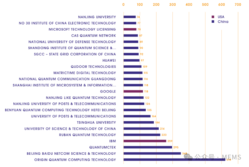 在中國申請(qǐng)的量子技術(shù)專利按申請(qǐng)量排名,前25位專利申請(qǐng)人中,除了三家來自美國的申請(qǐng)人(IBM、谷歌和微軟),其他全部為中國本土機(jī)構(gòu),包括本源量子計(jì)算科技(合肥)股份有限公司、北京百度網(wǎng)訊科技有限公司、科大國盾量子技術(shù)股份有限公司、如班量子科技有限公司、中國科學(xué)技術(shù)大學(xué)、清華大學(xué)、北京郵電大學(xué)及南京郵電大學(xué)等。