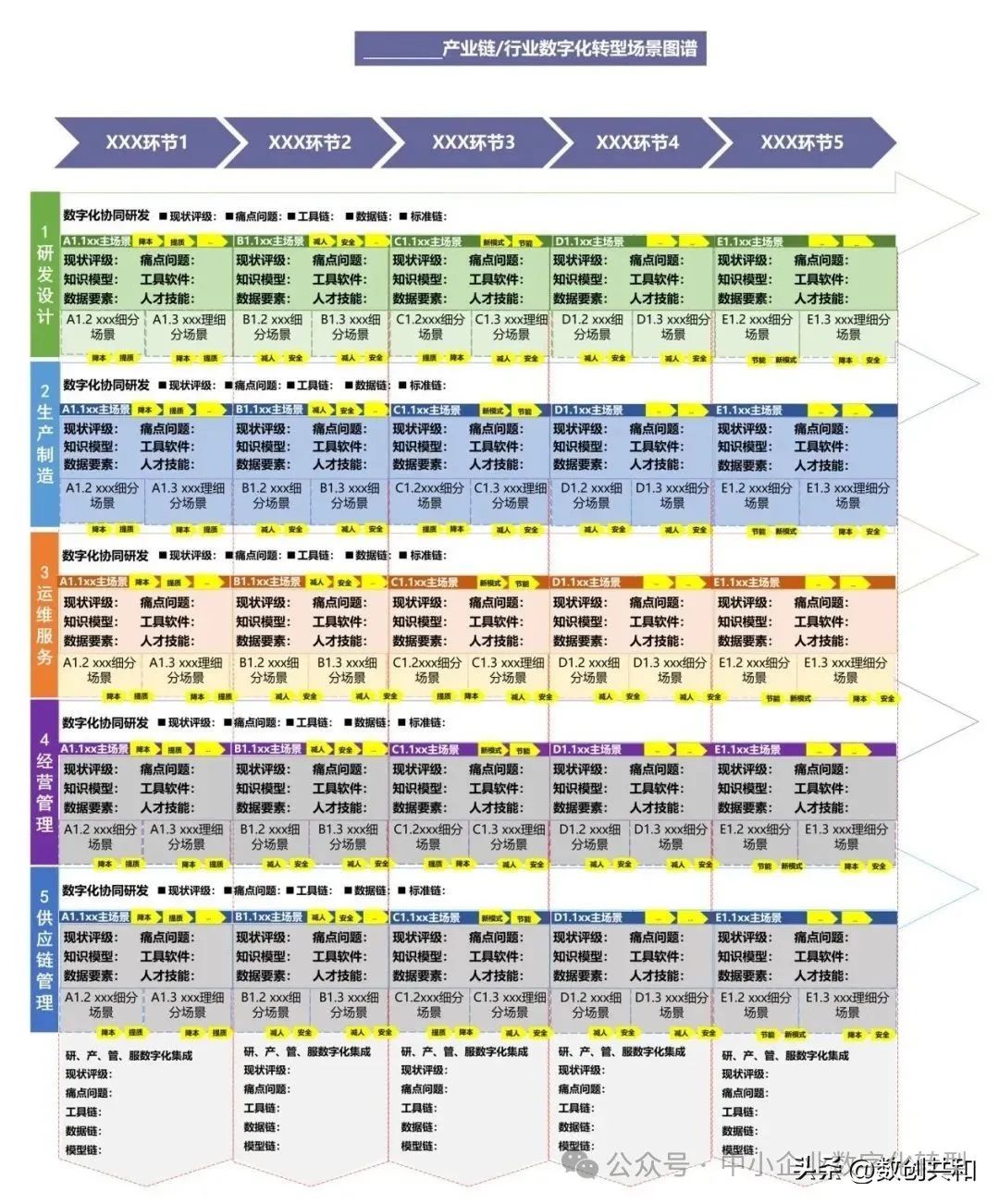 聚焦產(chǎn)業(yè)鏈上下游企業(yè)研發(fā)設(shè)計(jì)、生產(chǎn)制造、運(yùn)維服務(wù)、經(jīng)營(yíng)管理、供應(yīng)鏈管理等場(chǎng)景,以場(chǎng)景為切入點(diǎn)梳理數(shù)字化轉(zhuǎn)型痛點(diǎn)需求,繪制重點(diǎn)行業(yè)、重點(diǎn)產(chǎn)業(yè)鏈數(shù)字化轉(zhuǎn)型場(chǎng)景圖譜(簡(jiǎn)稱“一圖譜”),明確企業(yè)數(shù)字化轉(zhuǎn)型路徑,促進(jìn)產(chǎn)業(yè)鏈上下游企業(yè)協(xié)同開展轉(zhuǎn)型升級(jí)。分場(chǎng)景梳理數(shù)據(jù)要素、知識(shí)模型、工具軟件、人才技能等數(shù)字化轉(zhuǎn)型要素清單(簡(jiǎn)稱“四清單”,合稱“一圖四清單”),助力政產(chǎn)學(xué)研各界聯(lián)合攻堅(jiān)場(chǎng)景數(shù)字化轉(zhuǎn)型關(guān)鍵難點(diǎn)。