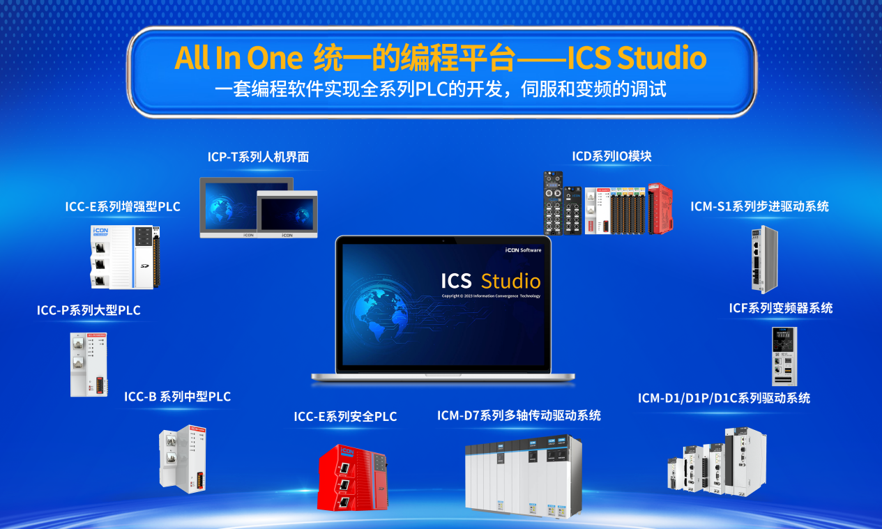 英孚康ICS Studio 全集成開發平臺,以全棧集成理念為核心,支持全系列PLC、伺服、步進、變頻器在同一個軟件平臺中開發與調試,實現一站式組態、編程、虛擬仿真。用戶無需切換多個工具,即可完成復雜項目的開發與優化,顯著提升開發效率。