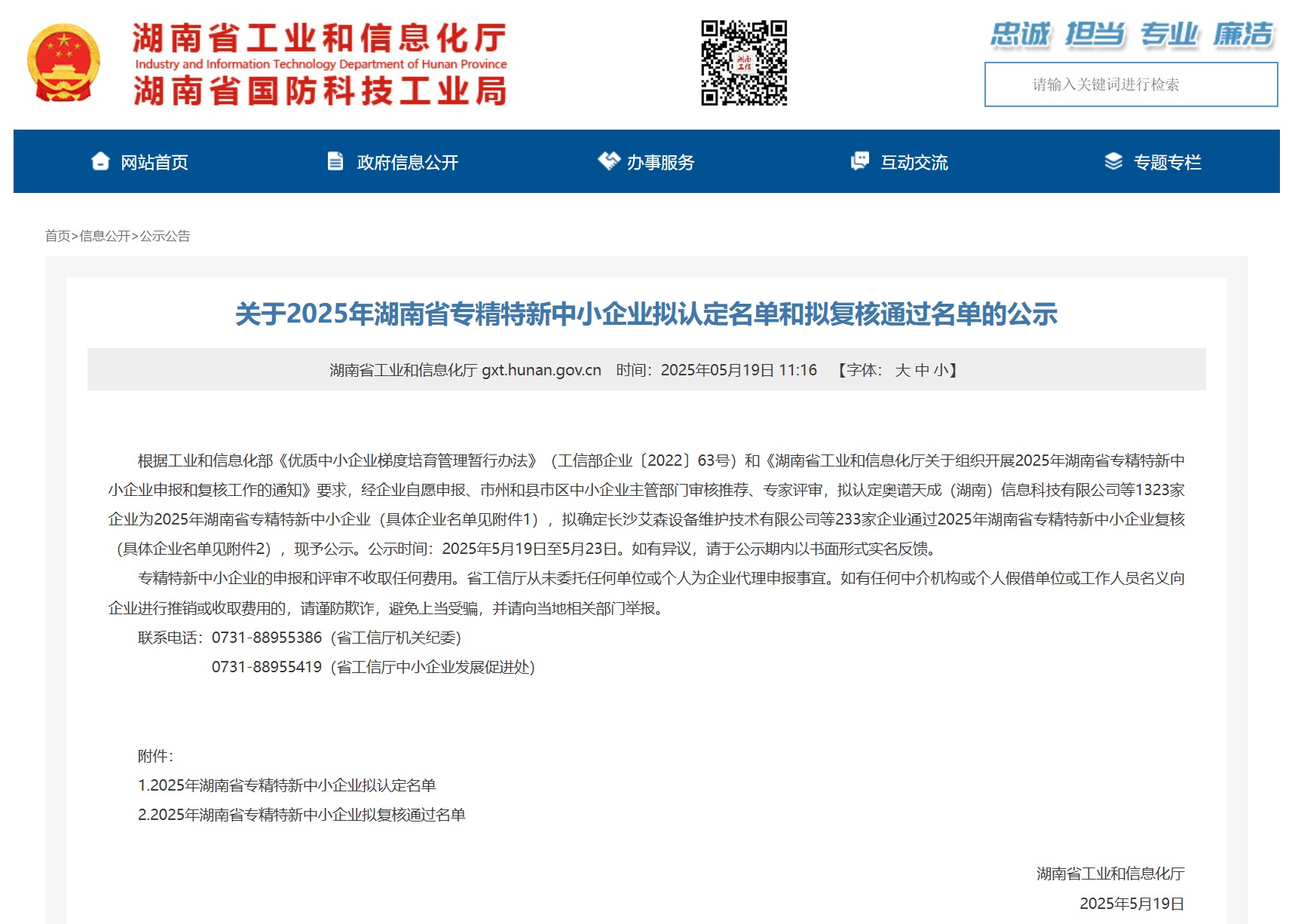 奧譜天成·集團湖南子公司憑借在光譜分析領域的技術積淀與持續創新,成功入選湖南省專精特新中小企業名單,充分展現了企業在專業化、精細化、特色化和創新能力等方面的顯著優勢。