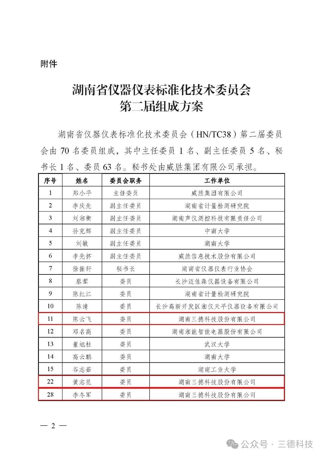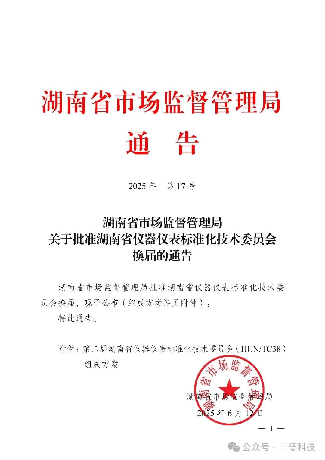 近日,湖南省市場監(jiān)督管理局發(fā)布《關(guān)于批準(zhǔn)湖南省儀器儀表標(biāo)準(zhǔn)化技術(shù)委員會換屆的通告》,正式公布第二屆委員會70人組成名單。三德科技技術(shù)專家陳云飛、黃志昆、李冬軍三人同時獲聘為委員,高度凸顯了我司在儀器儀表領(lǐng)域的技術(shù)影響力和標(biāo)準(zhǔn)化建設(shè)參與度。
