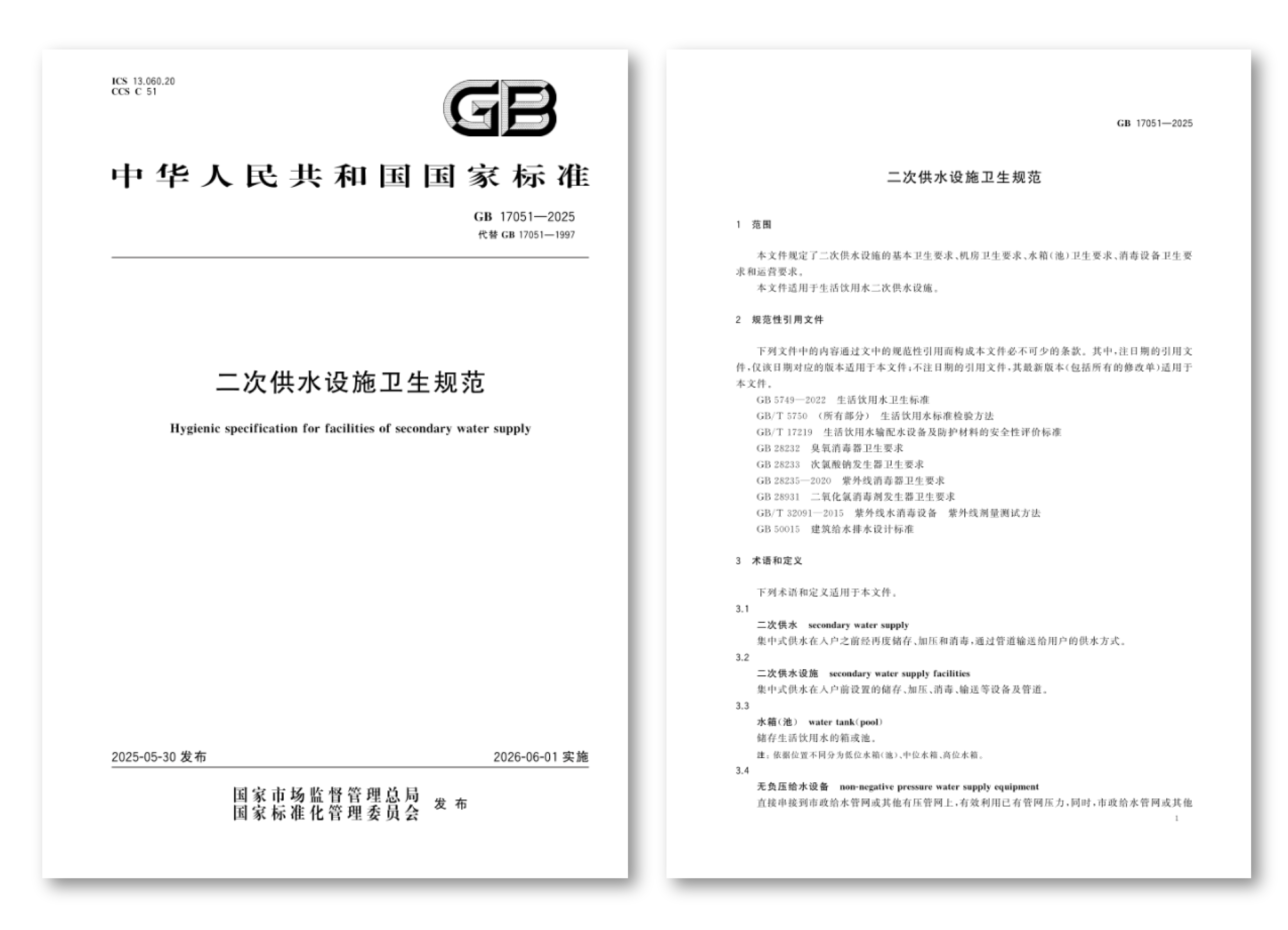 GB 17051-2025二次供水設(shè)施衛(wèi)生規(guī)范,2025-05-30 發(fā)布,2026-06-01實施。此標準規(guī)定了二次供水設(shè)施的基本衛(wèi)生要求、機房衛(wèi)生要求、水箱(池)衛(wèi)生要求、消毒設(shè)備衛(wèi)生要求和運營要求。此標準適用于生活飲用水二次供水設(shè)施。