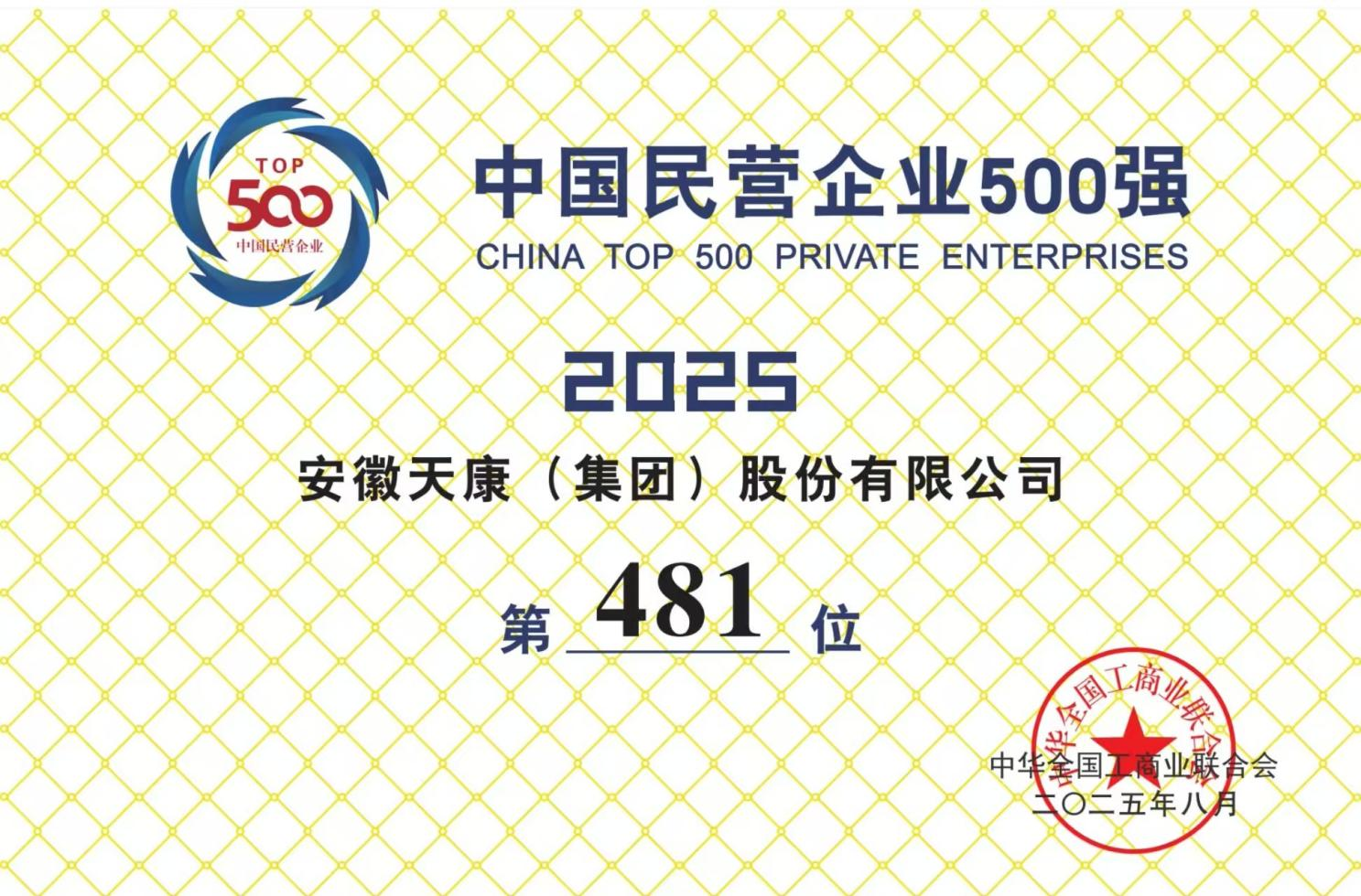 安徽天康集團入選2025年“中國民營企業500強”