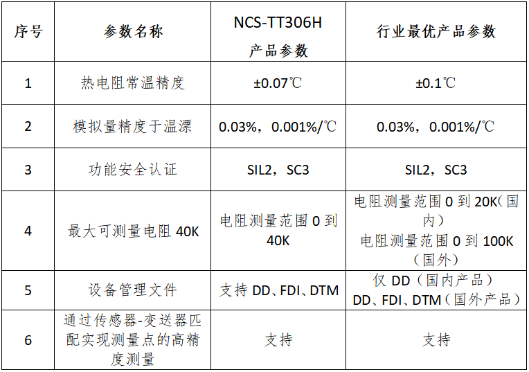 NCS-TT306H采用數(shù)字化技術(shù),內(nèi)置24bit高性能ADC,實現(xiàn)高可靠性、高測量精度和高長期穩(wěn)定性,滿足各種工業(yè)現(xiàn)場的測溫需求。真正雙通道設(shè)計,6端子的傳感器設(shè)計可滿足不同的雙輸入組合,可用于對冗余有要求的關(guān)鍵應(yīng)用場合。符合IEC 61508功能安全標準的全面評估,安全等級達到了SIL2、SC3的要求。
