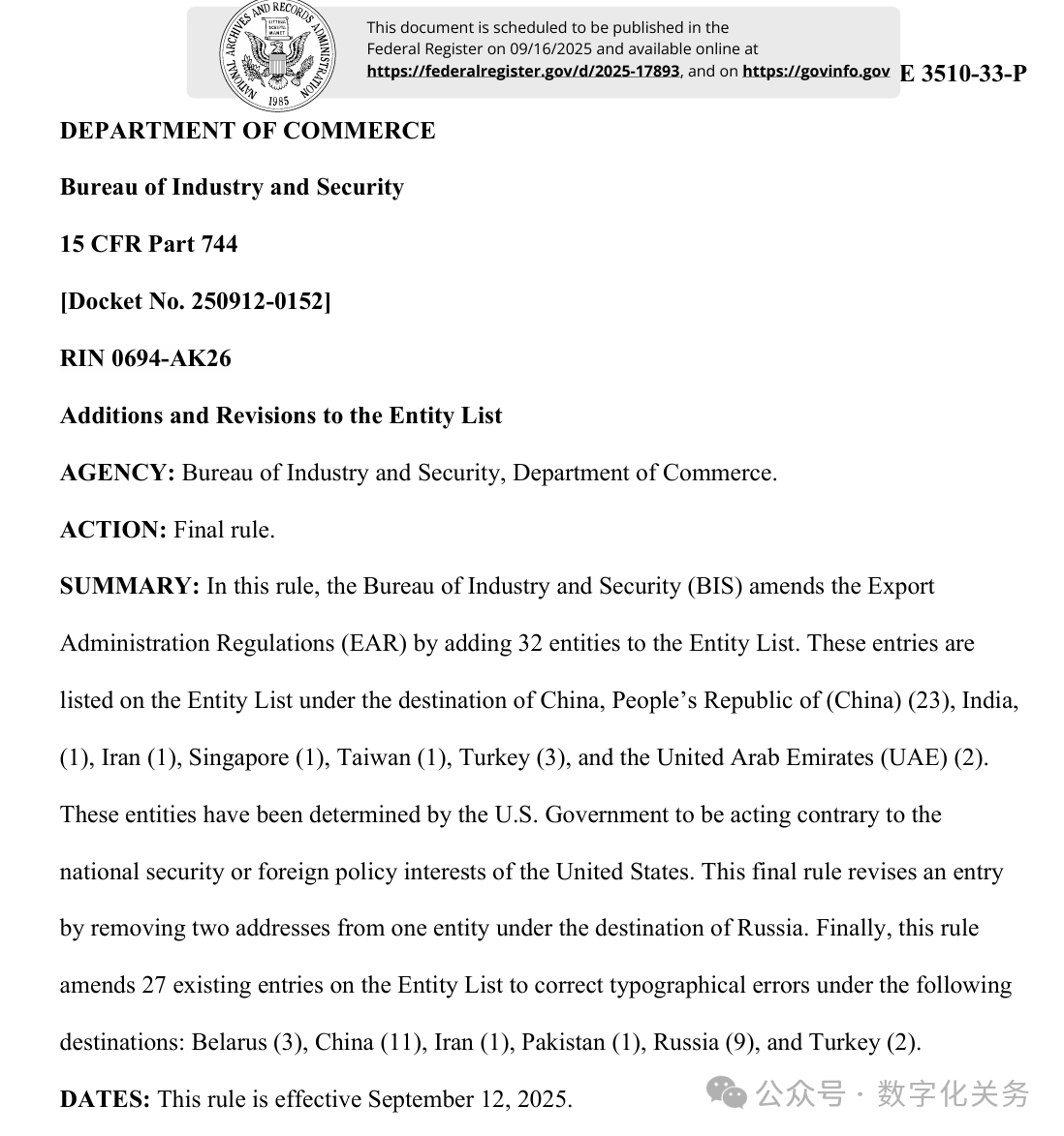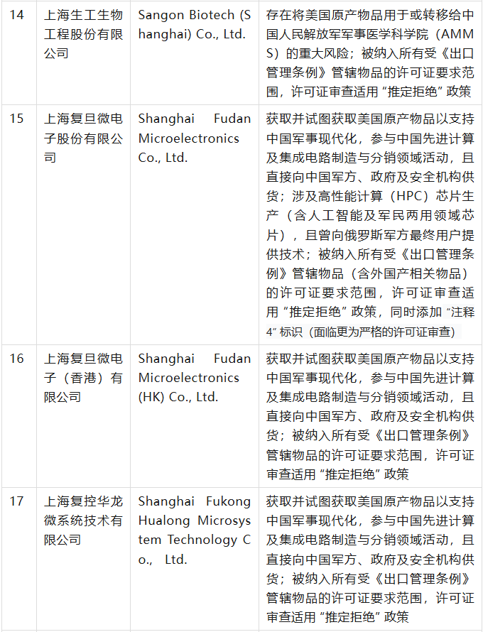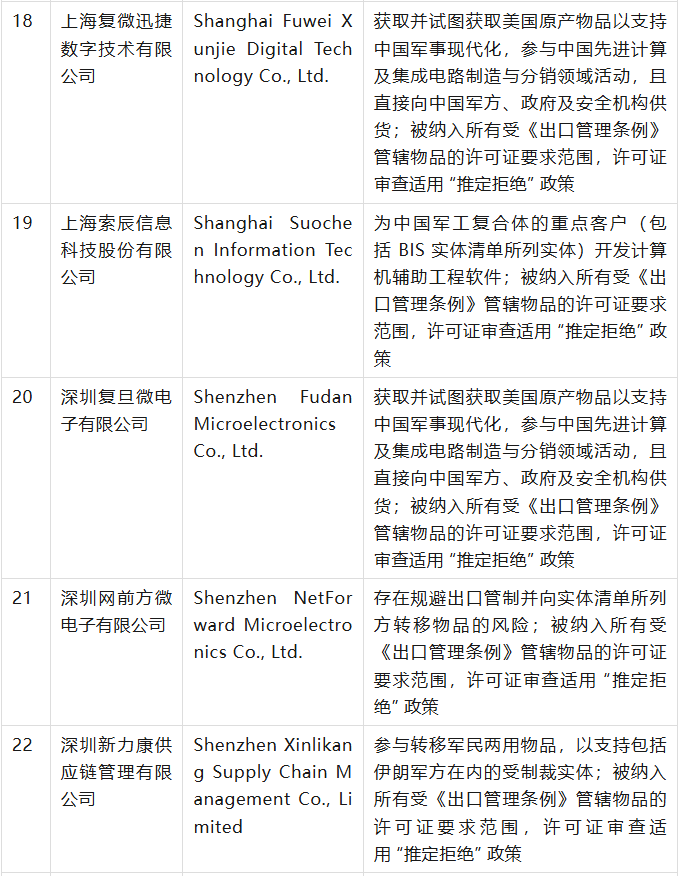 美國商務部工業與安全局(BIS)于9月12日在美國聯邦公報發布公告,通過修訂《出口管理條例》(EAR),將 32 家實體新增至實體清單,其中有23家是中國公司,具體清單、列入實體清單的理由及管制措施如下表(表中提及的列入實體清單的理由為BIS方面指認,不代表本號對該理由或相關事實的認可):