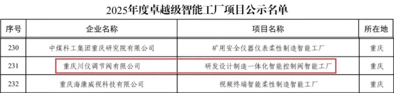 川儀股份所屬重慶川儀調(diào)節(jié)閥有限公司“研發(fā)設(shè)計(jì)制造一體化智能控制閥智能工廠”入選工業(yè)和信息化部“2025年度卓越級智能工廠”