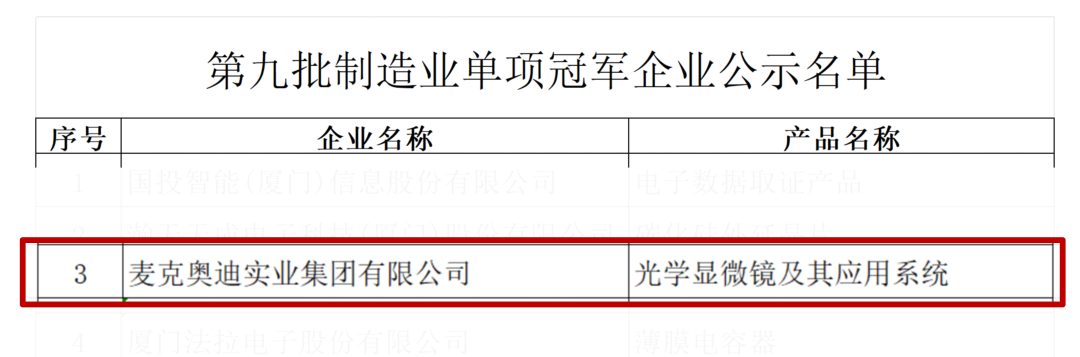 制造業(yè)單項(xiàng)冠軍企業(yè),是指長期專注于制造業(yè)特定細(xì)分領(lǐng)域,生產(chǎn)技術(shù)或工藝水平國際先進(jìn),單項(xiàng)產(chǎn)品(生產(chǎn)性服務(wù))市場占有率位居全球前列的企業(yè)。該獎項(xiàng)是工信部為推動制造業(yè)高質(zhì)量發(fā)展而開展的培育提升專項(xiàng)行動的重要組成部分,代表了我國制造業(yè)向中高端邁進(jìn)的方向。此次麥克奧迪光學(xué)“顯微鏡及其應(yīng)用系統(tǒng)”產(chǎn)品的成功獲評,既是對我司在該領(lǐng)域的技術(shù)積淀、市場份額、品質(zhì)把控等方面的高度認(rèn)可,更是對“創(chuàng)新智造,引領(lǐng)顯微科技”理念的最佳詮釋。