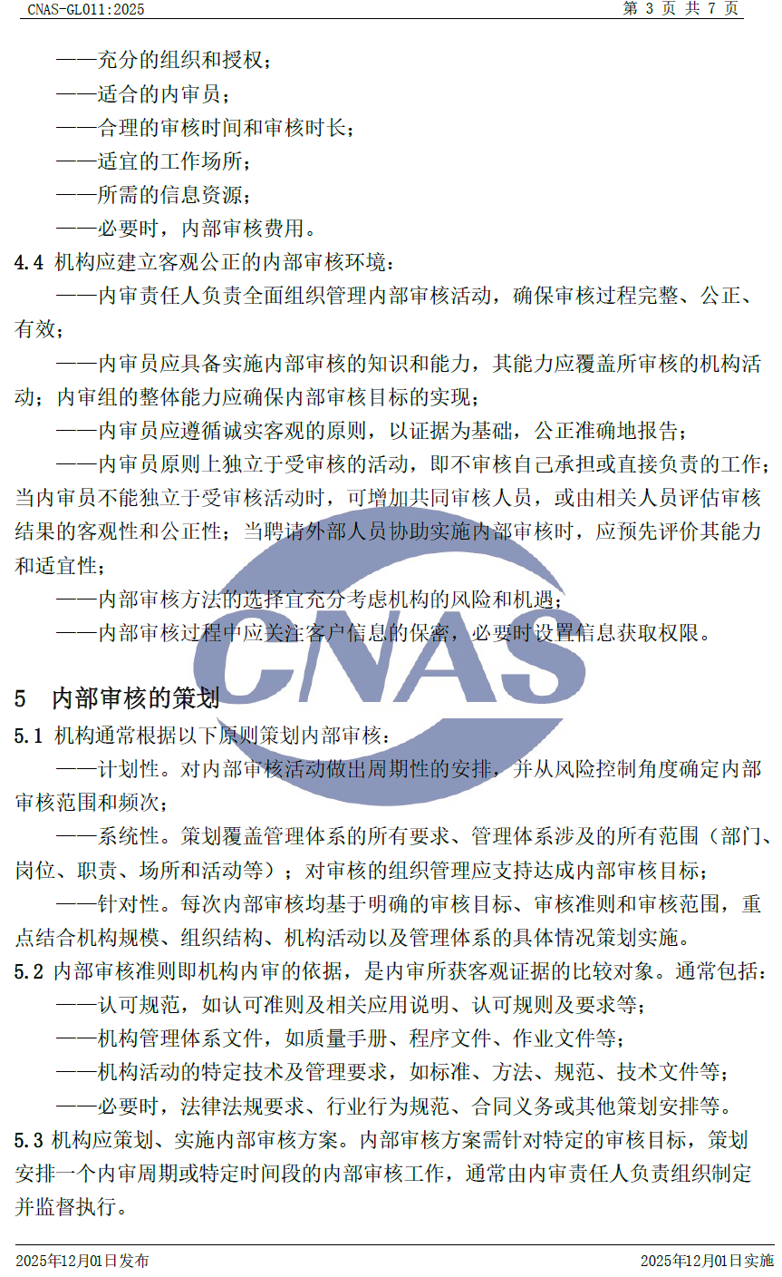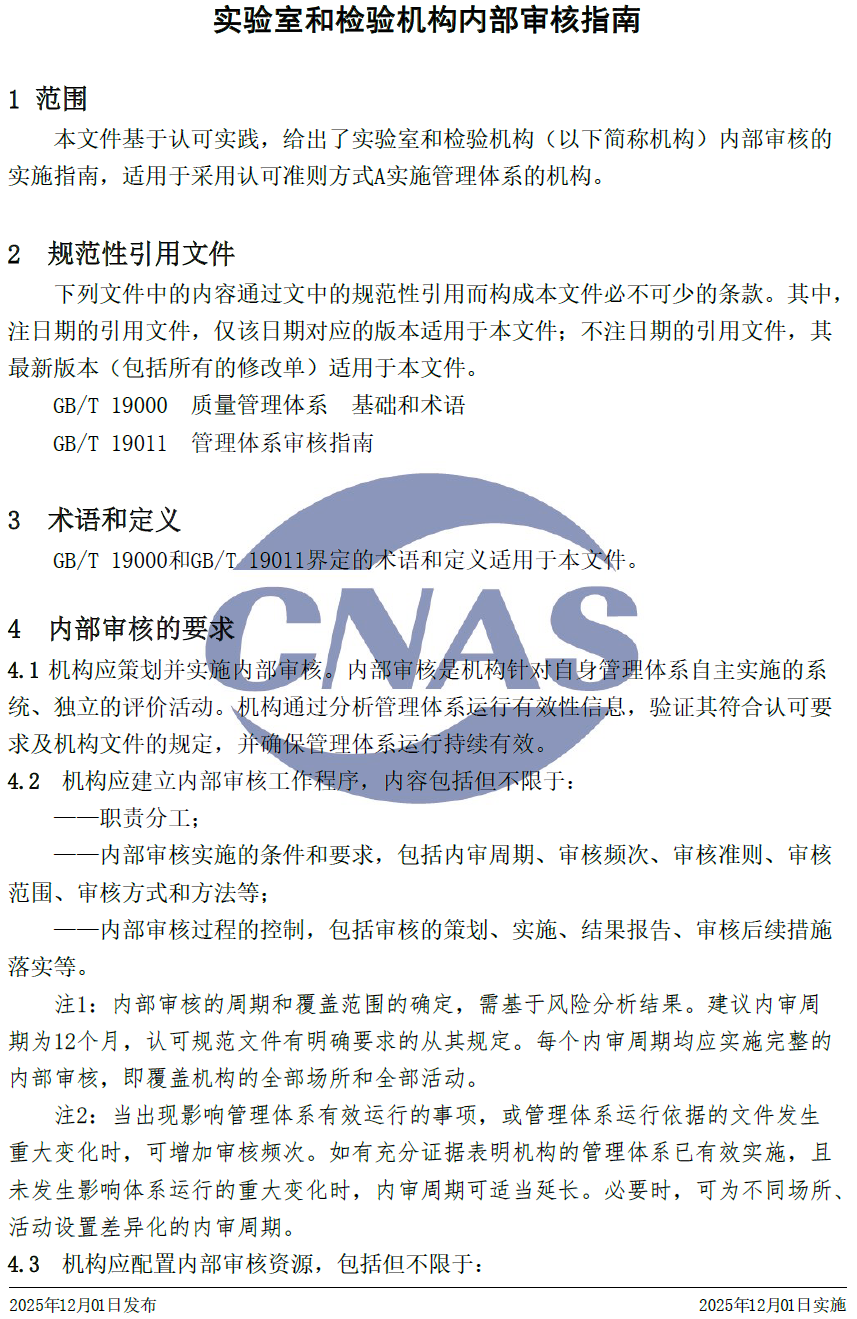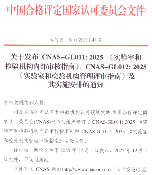 CNAS-GL011:2025 《實(shí)驗(yàn)室和檢驗(yàn)機(jī)構(gòu)內(nèi)部審核指南》與CNAS-GL011:2018相比,除結(jié)構(gòu)調(diào)整和編輯性改動(dòng)外,主要技術(shù)變化如下: