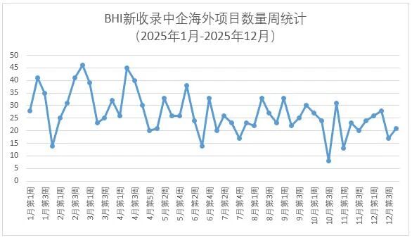 據(jù)BHI中企海外項(xiàng)目數(shù)據(jù)庫(kù)監(jiān)測(cè),上周(12月22日-26日)BHI新收錄中企新簽約/中標(biāo)/公告海外項(xiàng)目21個(gè),較此前小幅回升。其中中國(guó)交建7個(gè)項(xiàng)目、中國(guó)能建6個(gè)項(xiàng)目。2025年新收錄項(xiàng)目超過(guò)1340個(gè)。近一年每周新收錄項(xiàng)目數(shù)量趨勢(shì)統(tǒng)計(jì)詳見(jiàn)下圖。