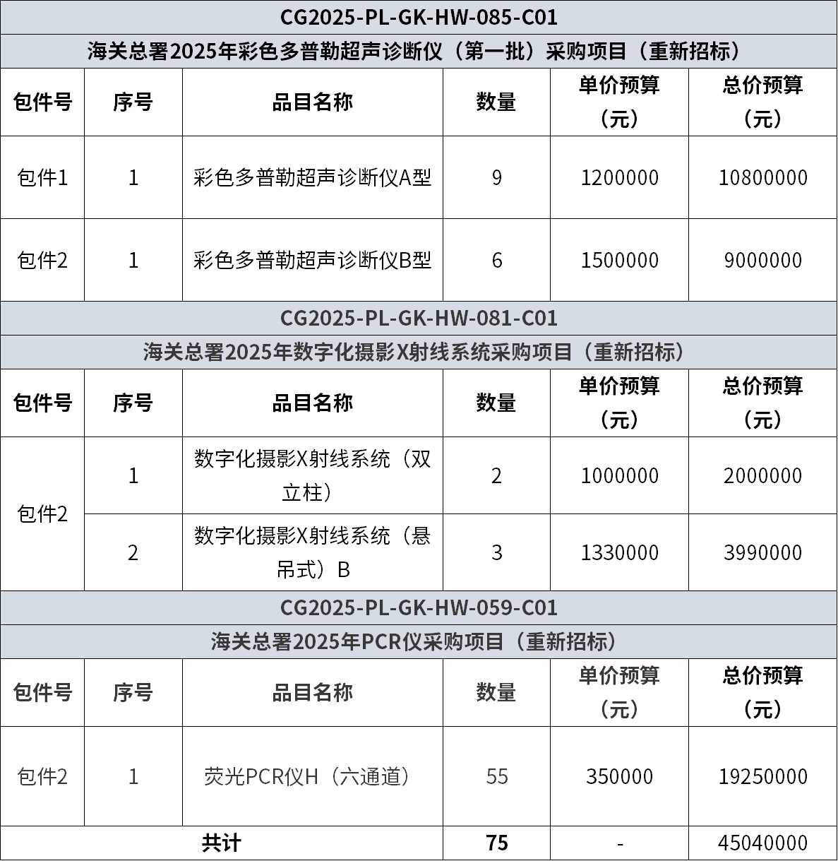 公告明確,此次重新招標覆蓋數字化攝影X射線系統、熒光PCR儀、彩色多普勒超聲診斷儀等儀器設備。共計75臺套設備、總預算4504萬元。