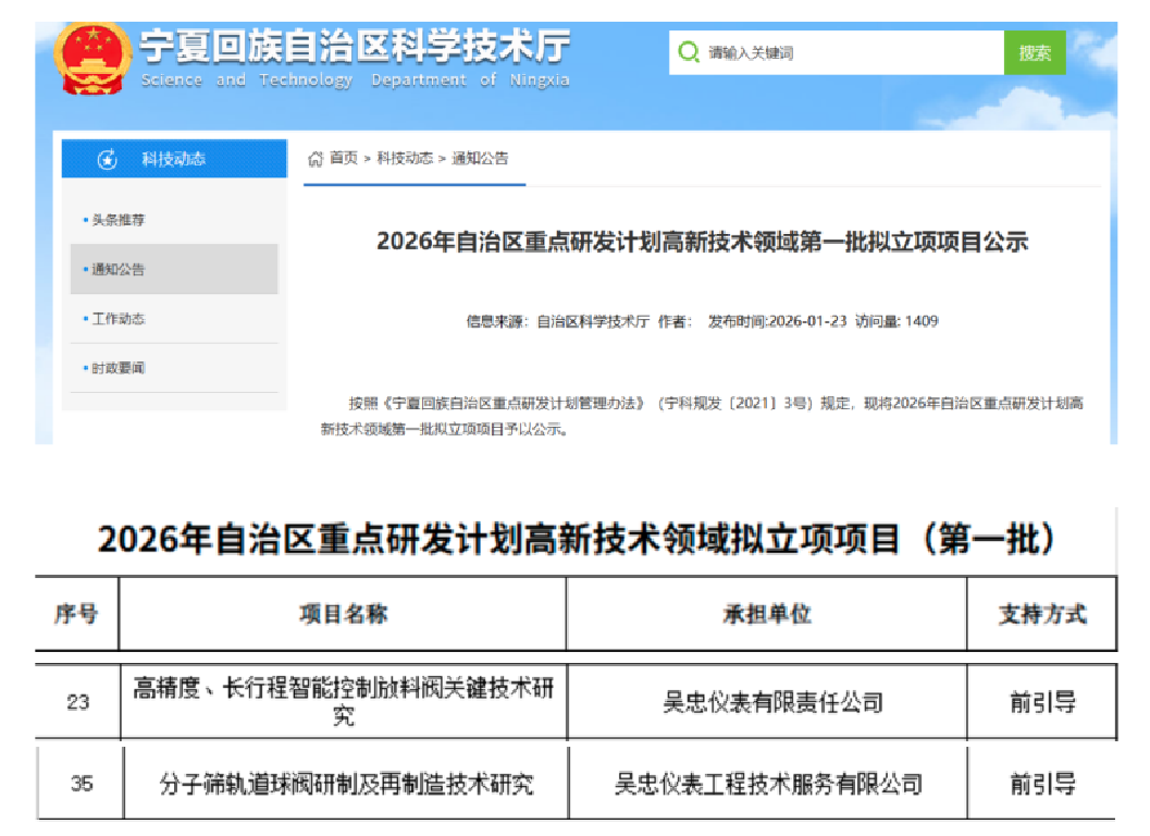 2026123日,寧夏回族自治區科學技術廳發布2026年自治區重點研發計劃高新技術領域第一批擬立項項目名單,吳忠儀表有限責任公司申報的“高精度、長行程智能控制放料閥關鍵技術研究”、吳忠儀表工程技術服務有限公司申報的“分子篩軌道球閥研制及再制造技術研究”兩個項目成功入選。