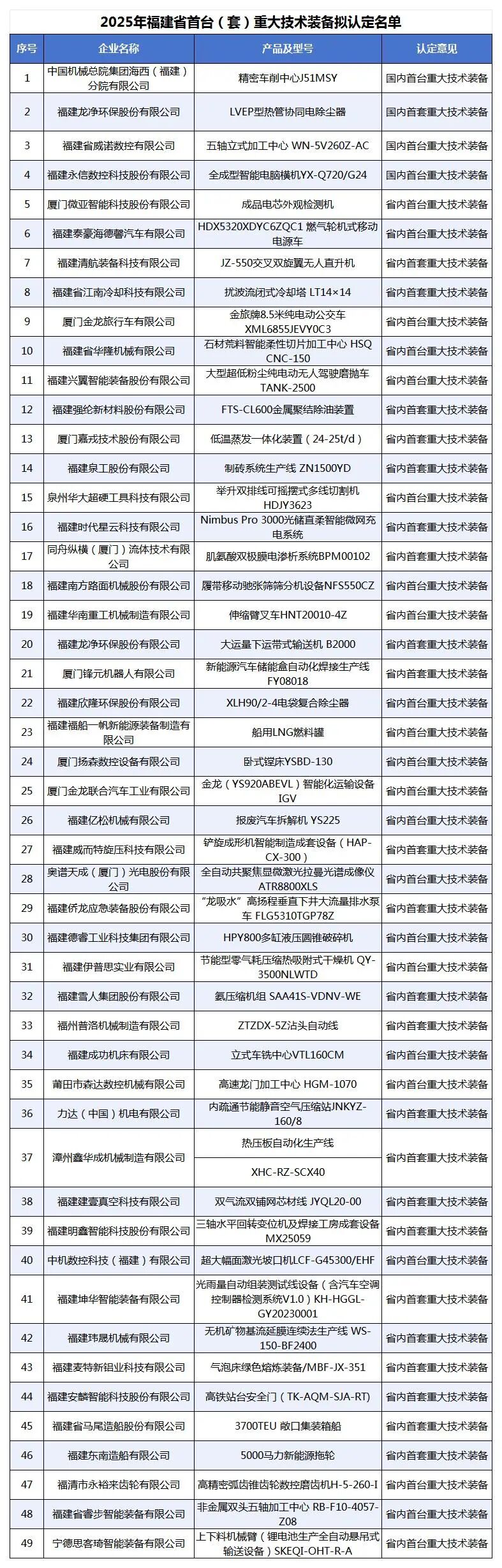 福建省工信廳公示2025年福建省首臺(套)重大技術(shù)裝備認(rèn)定名單49家企業(yè)上榜一起來看下具體名單。