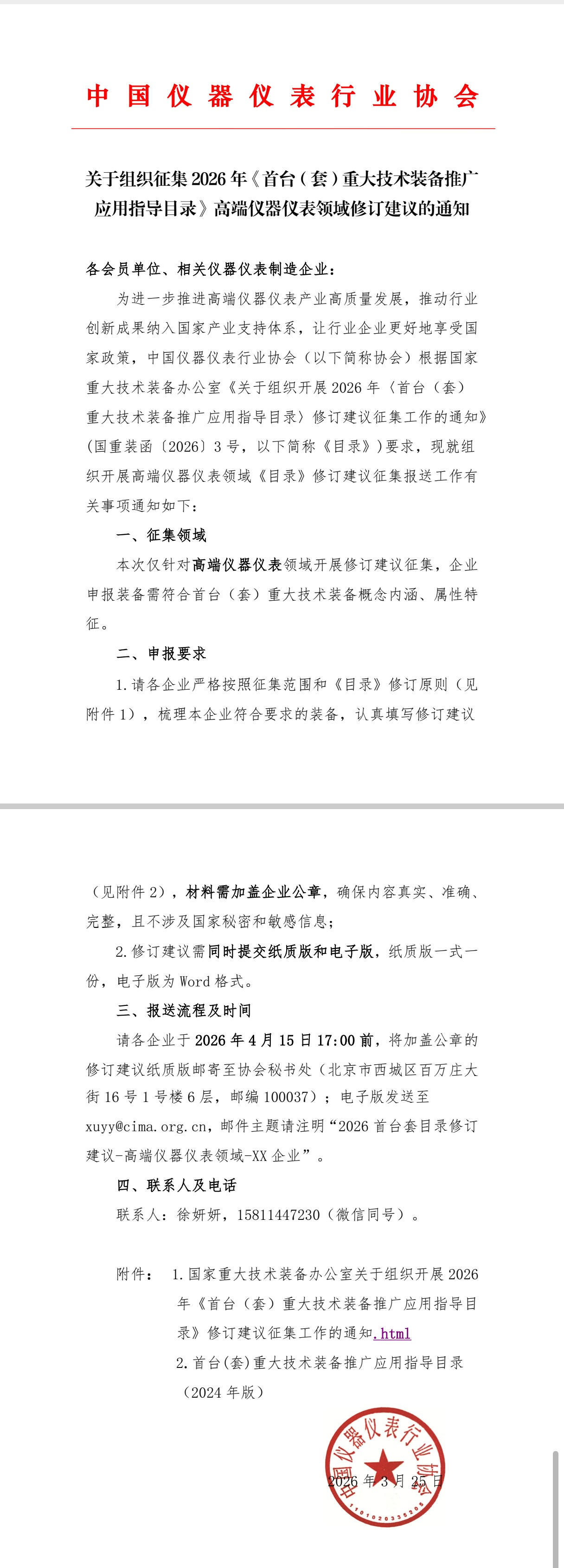 推廣應用指導目錄》高端儀器儀表領域修訂建議的通知